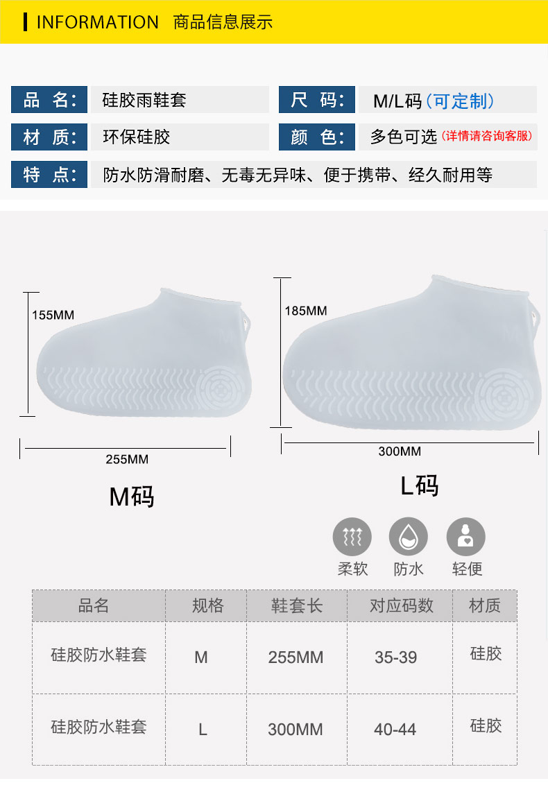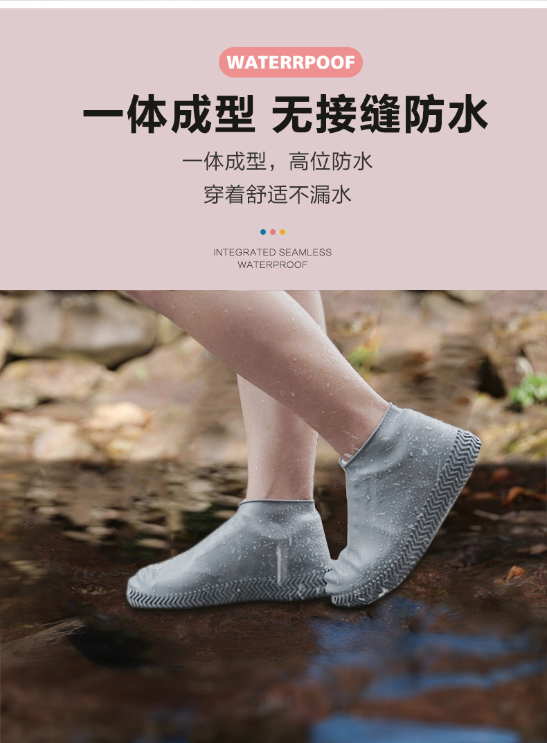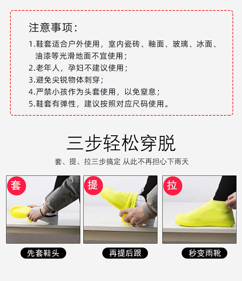 這款硅膠防水鞋套使用的時候就比較方便了,在需要使用的的時候把鞋套進去就可以了,小巧方便,不占地方又不影響美觀,方便省時,重要的是,即使是大雨磅礴的天氣,你的鞋子依舊可以完好無損。它使用的是食品級硅膠原材料制作的,環(huán)保安全,無異味,不會讓你聞到任何廉價塑料的味道。